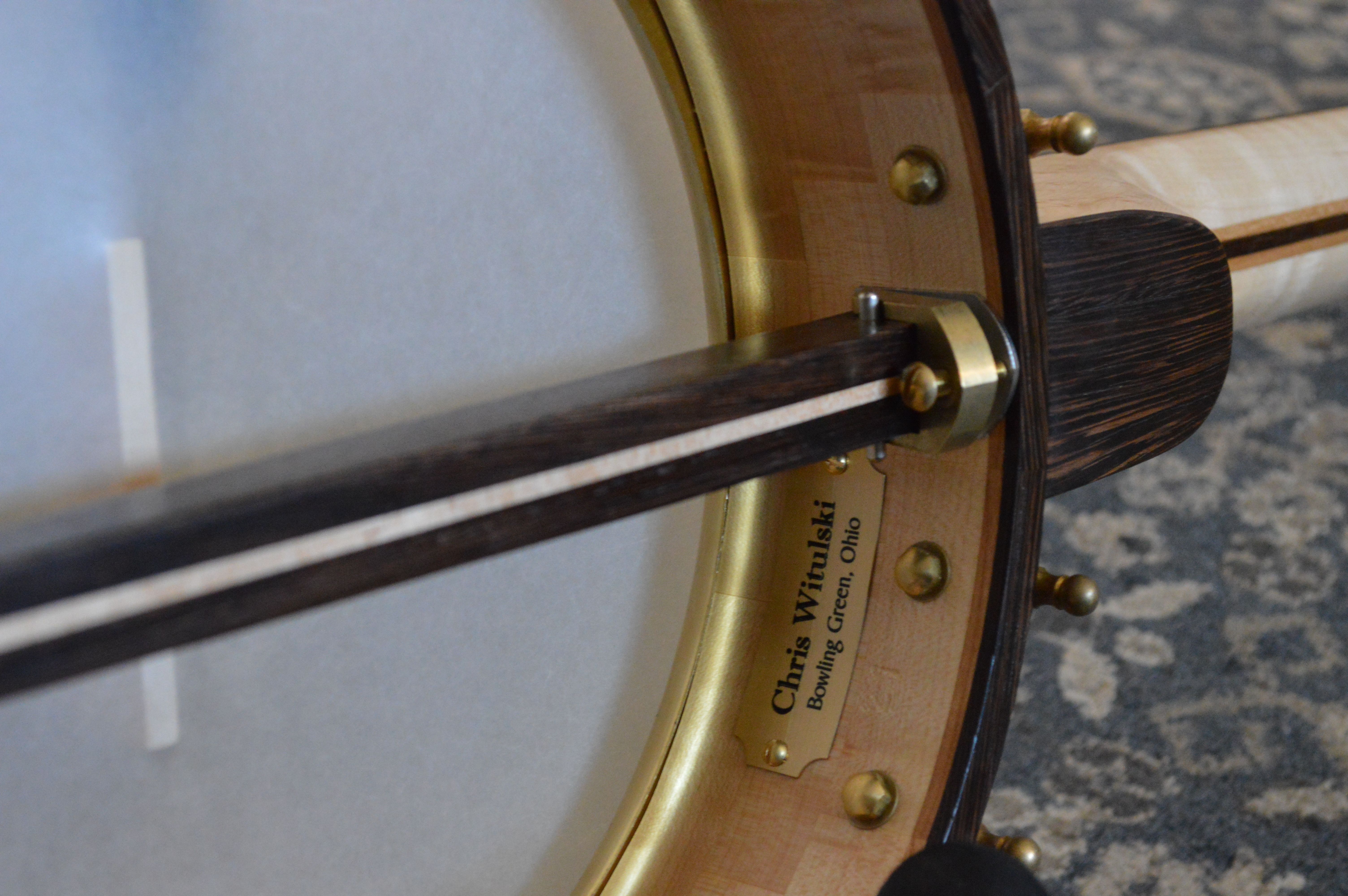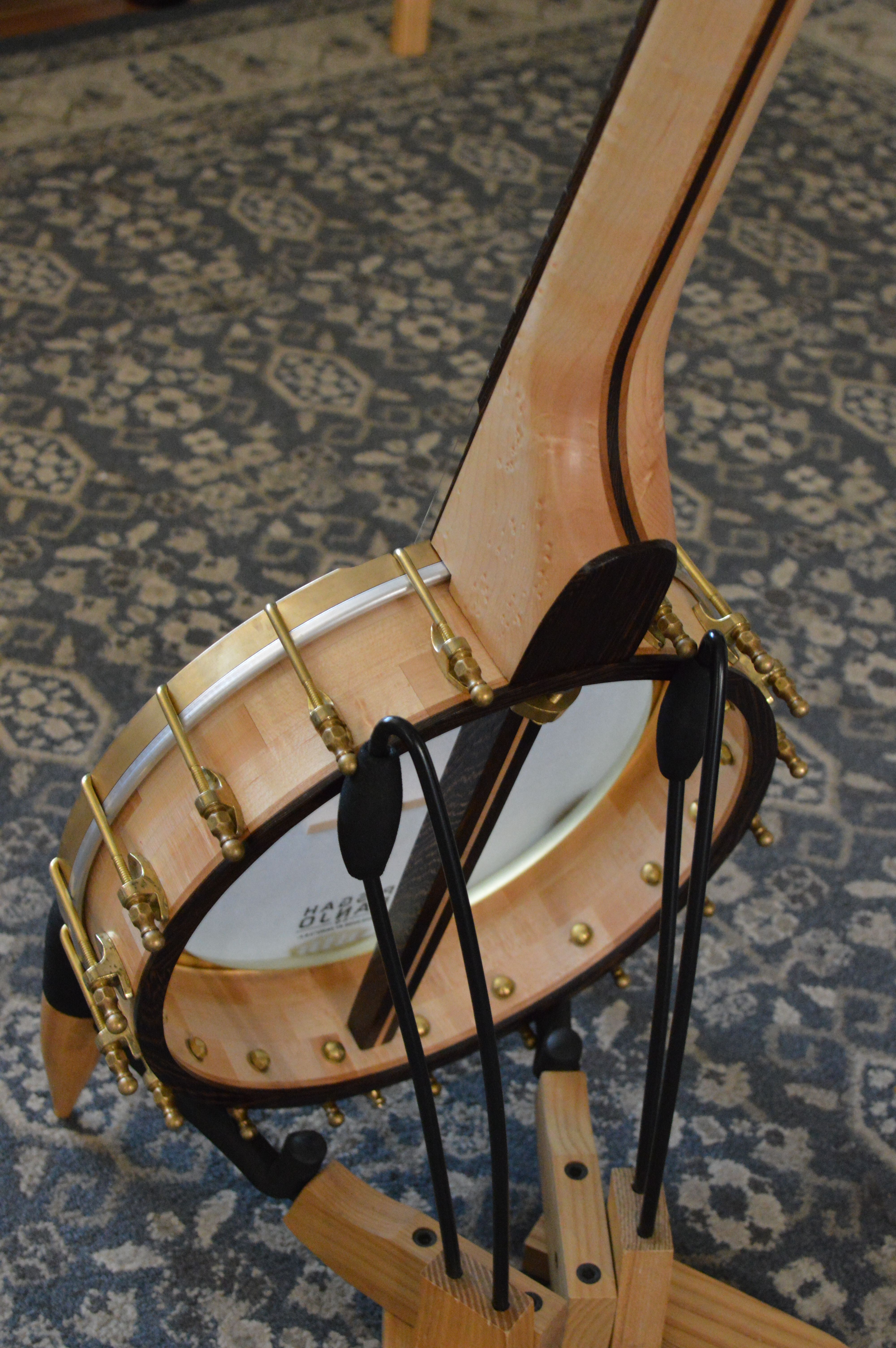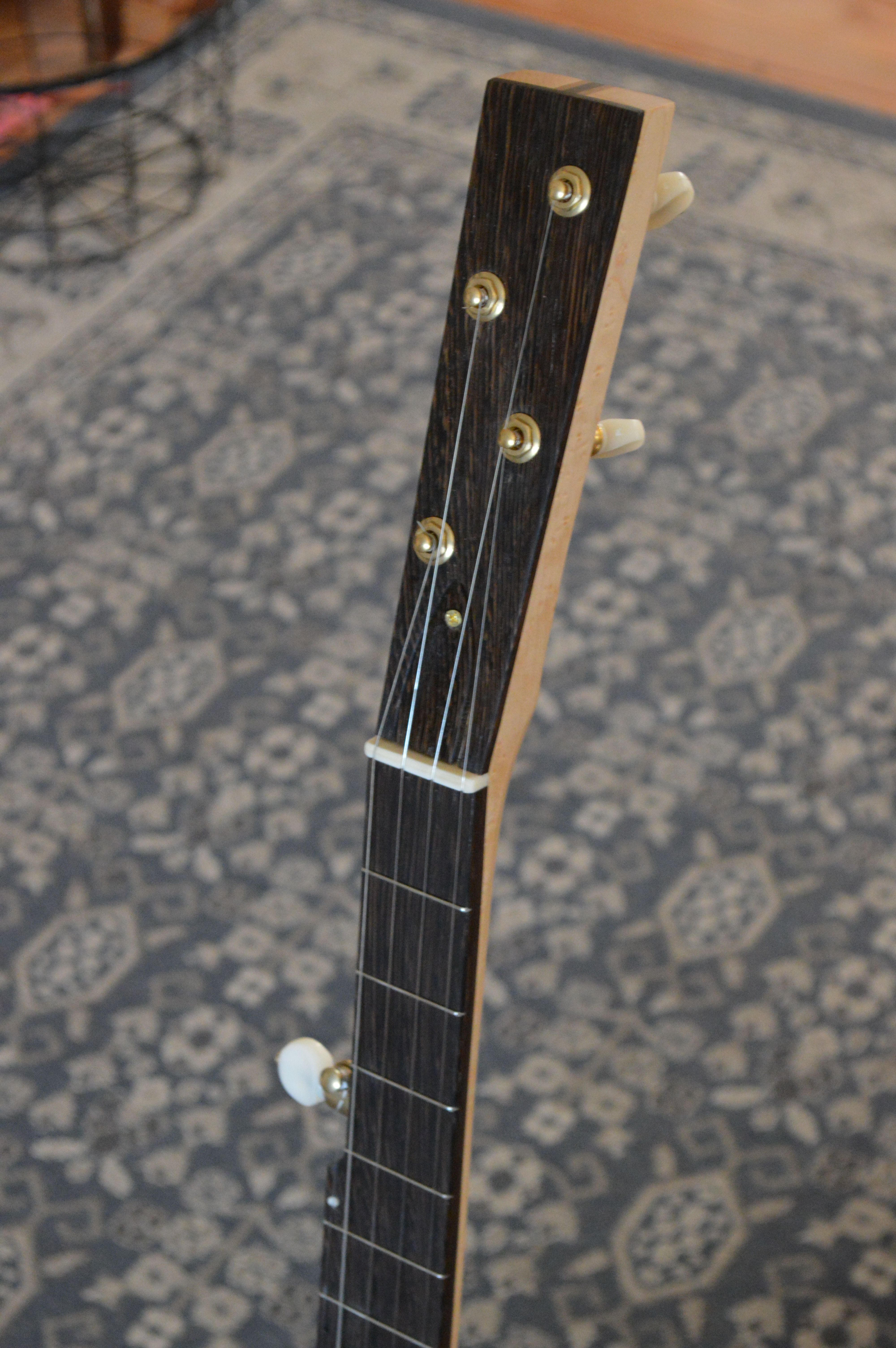 I recently received two commissions that became banjo numbers 22 and 23. While I was at it—and since I recently sold my keeper—I made this one for myself. I had never worked birdseye maple before and I'm really happy with how it came out. The cherry accents and the wenge fingerboard, heel cap, peghead overlay, and rim cap came out looking great! This one is a bit punchy because of the 11 inch and slightly thicker rim. My hope was to get a good one for a jam, and I think this will do the trick.