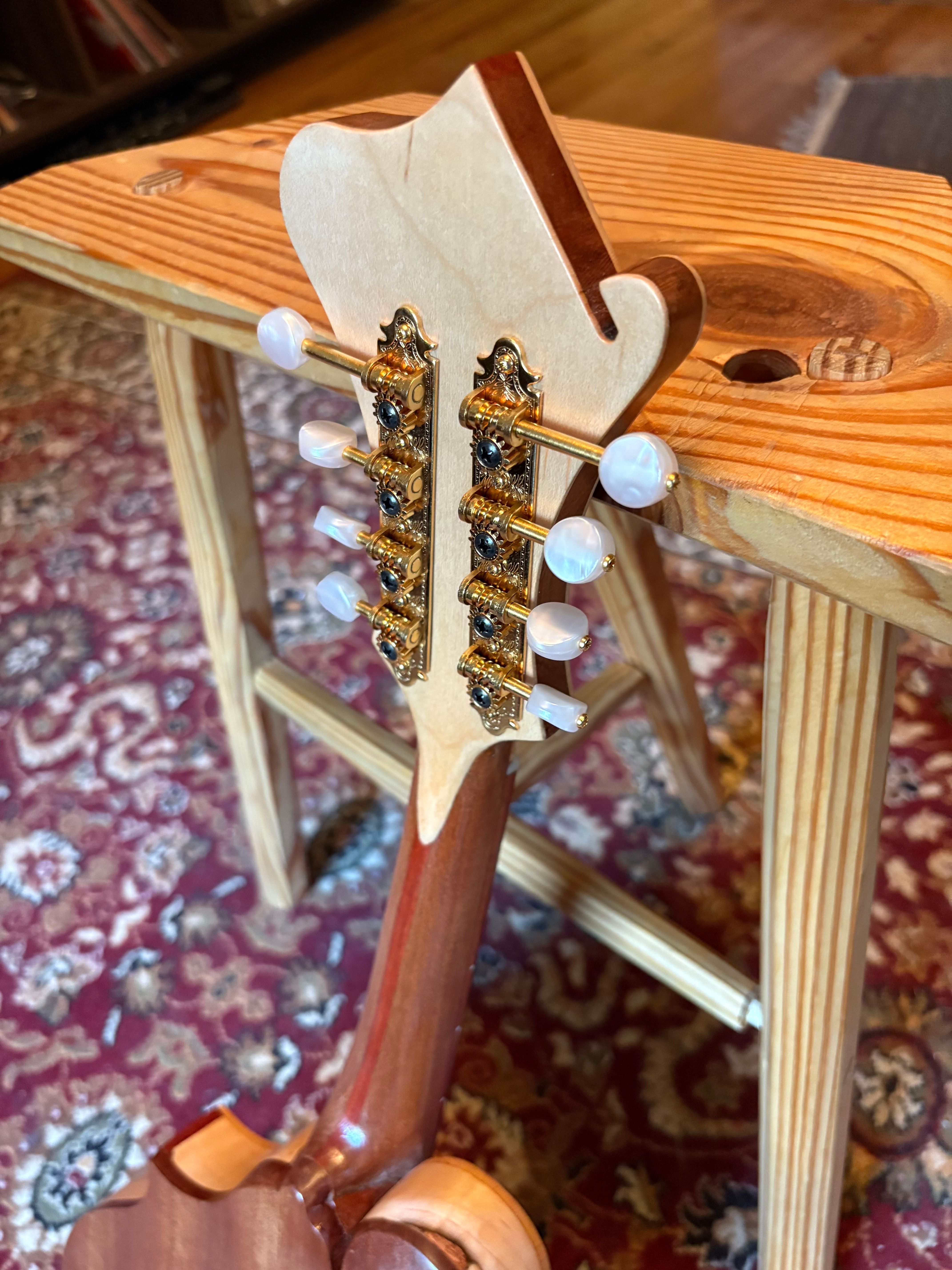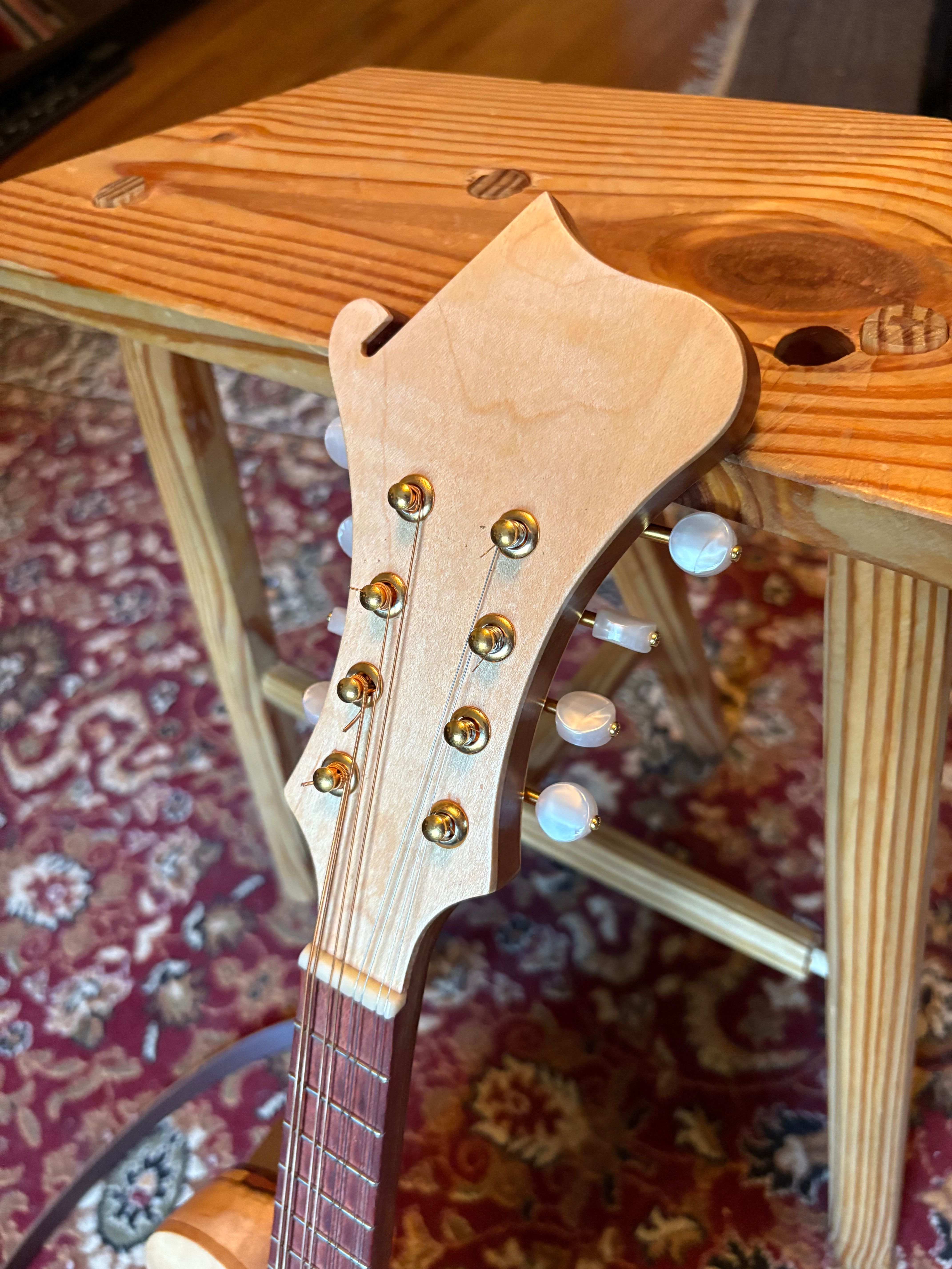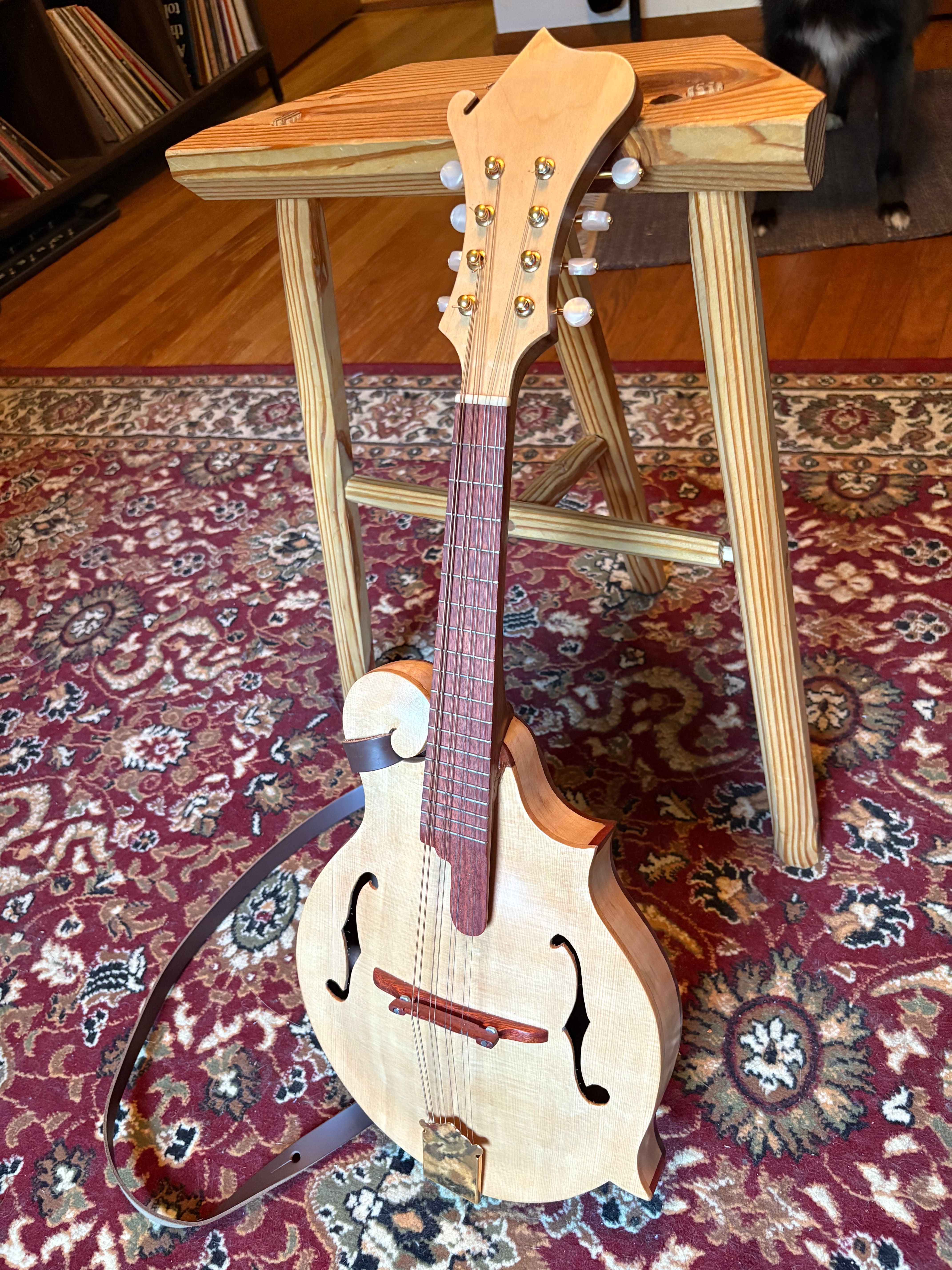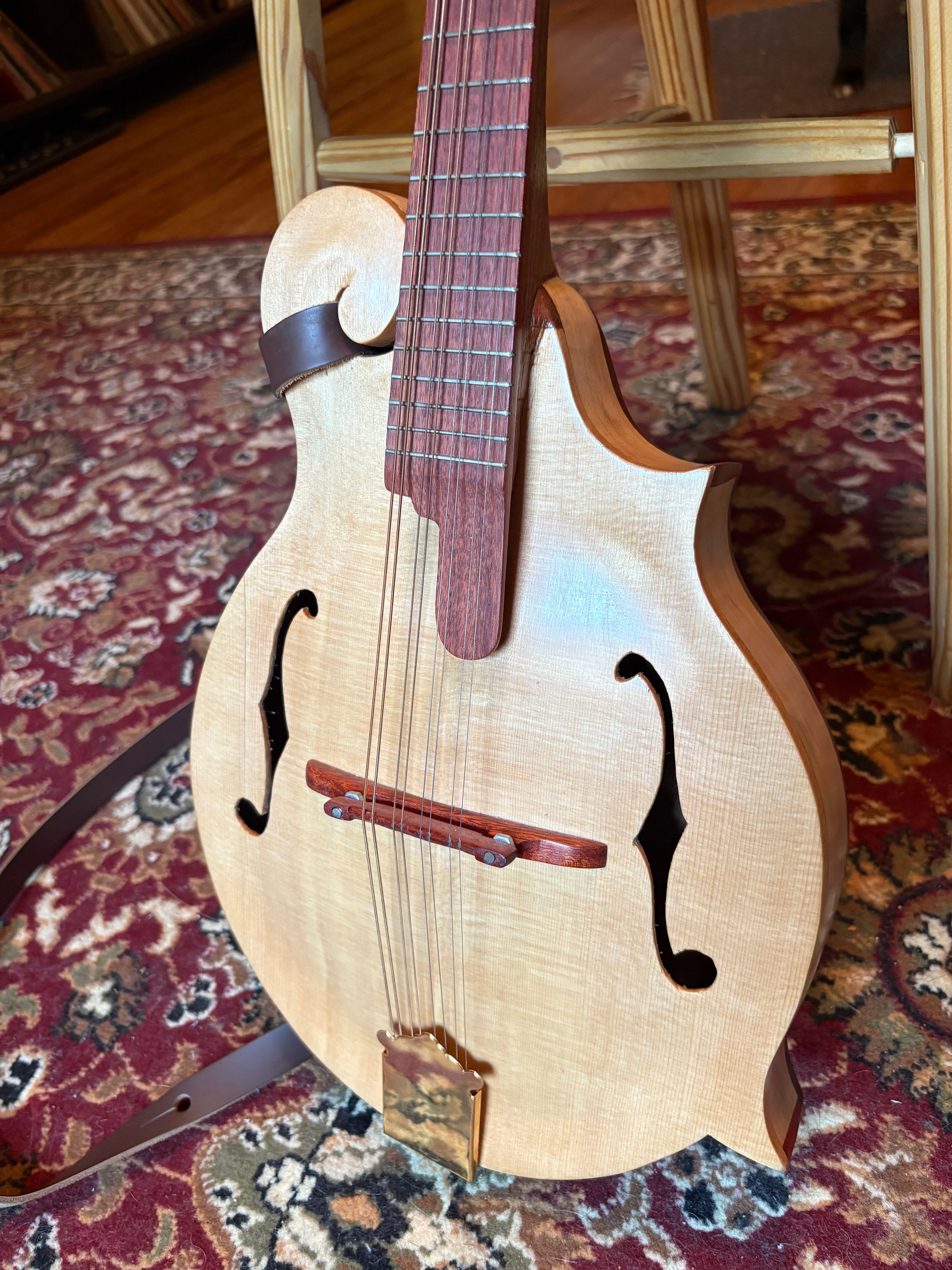 This summer (2025), I finally gave up on finding a mandolin that I enjoyed playing and decided to try my hand at building one. I based it off of the Gibson F5 copy described in Roger Siminoff's book on building a bluegrass mandolin. The back, sides, and neck are from wood that I had around. The bloodwood fretboard and accents gave a nice color and I really love the quilted Sitka spruce that I got from Alaska Woods. (I also ordered a piece of cedar for an archtop, a project that I'll hopefully get into before too long.)